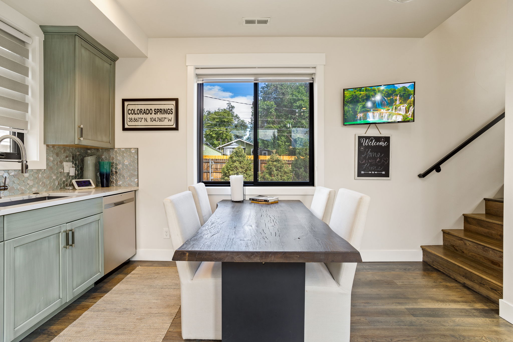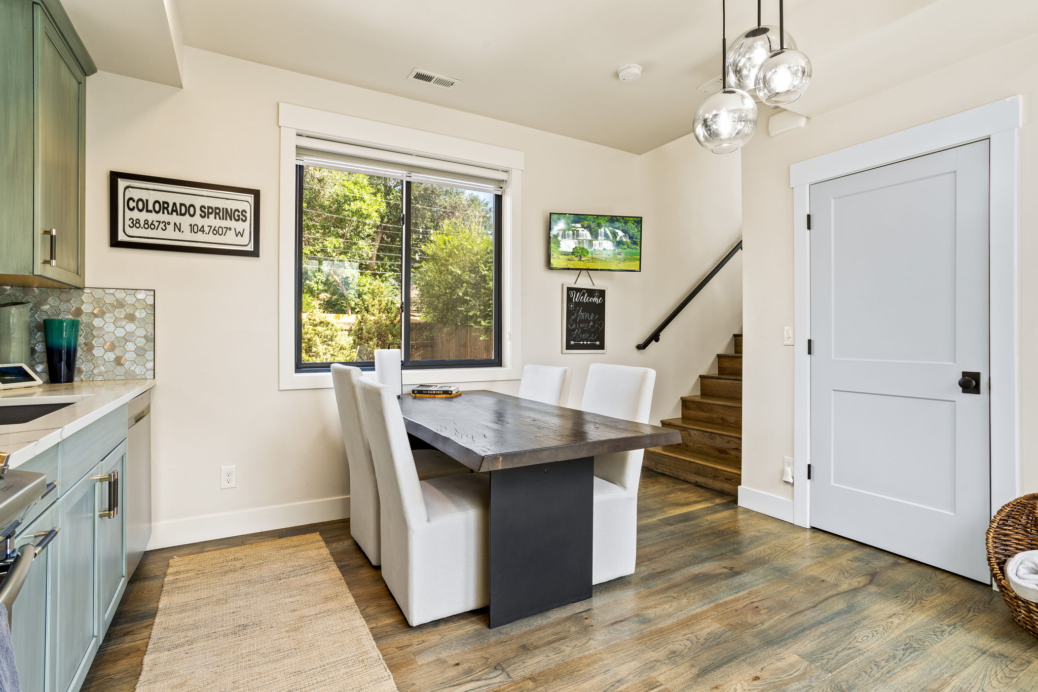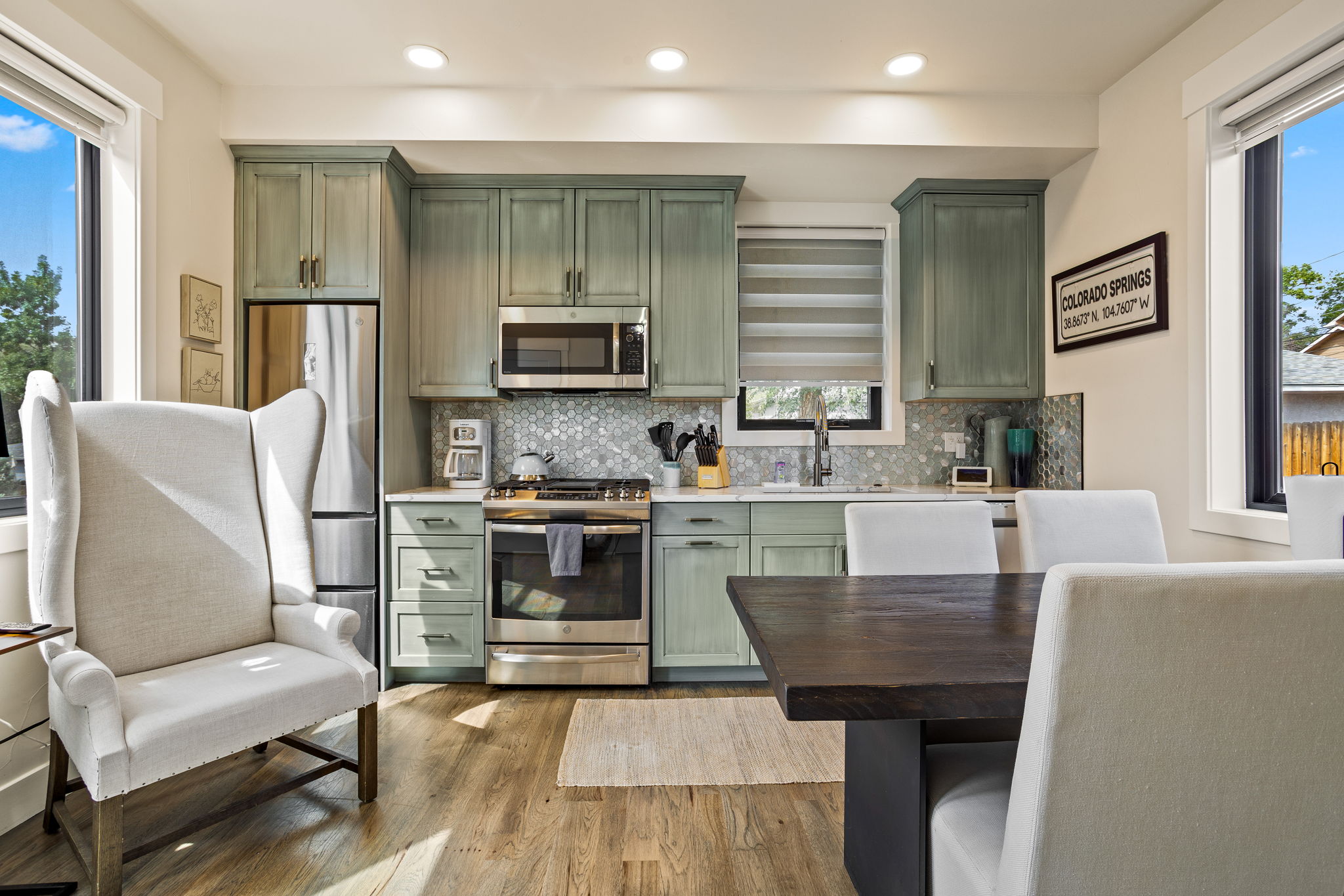 Wake up to breathtaking views of Pikes Peak every morning or unwind on the patio with cool Colorado evenings. Inside, you’ll find a fully equipped kitchen — ideal for preparing delicious meals and baking treats — plus a cozy sectional perfect for reading or relaxing after a day of adventure. This property truly has everything you need for an exceptional getaway. From stunning views and luxurious accommodations to charming details and peaceful surroundings, it's designed to make your stay memorable. Whether you're celebrating a special occasion or just seeking a peaceful escape, this luxury home provides an idyllic setting for your Colorado adventure. Enter through the kitchen area into this unique layout featuring a bedroom and bathroom on the lower level, with the living room situated on the top floor for added privacy and elevated views.